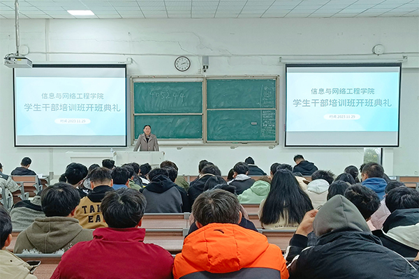 为了促进新生学生干部发挥先锋模范作用,提高新入职学生干部的责任意识与综合素质。11月29日,信息与网络工程学院在致知楼C111教室,举办2023年学生干部培训班开班典礼。信息与网络工程学院党政领导和有关教师出席本次开班典礼,学院2023级全体班级学生干部、分团委、学生会、易班工作站、心理委员联合会等学生组织新入职同学参加典礼。