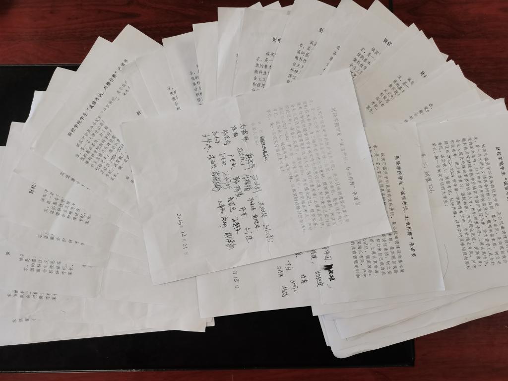 12月29日-1月4日,各班级辅导员召开考风考纪专题班会,督促学生认真复习迎考,遵守校规校纪,诚信文明考试。各班级签订“诚信考试 杜绝作弊”承诺书。