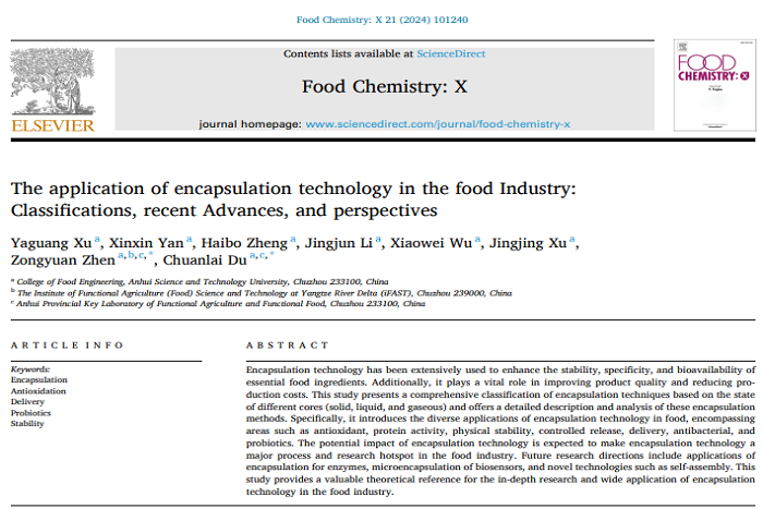近期,我校食品工程学院动物源食品精深加工与营养团队在中国科学院农林科学领域一区期刊Food Chemistry: X(IF=6.10)在线发表题为“The Application of Encapsulation Technology in the Food Industry: Classifications, Recent Advances, and Perspectives ”的综述论文。食品工程学院2021级食品加工与安全领域硕士研究生徐亚光为第一作者,杜传来教授和甄宗圆副教授为通讯作者,半岛app官方在线入口为第一完成单位。