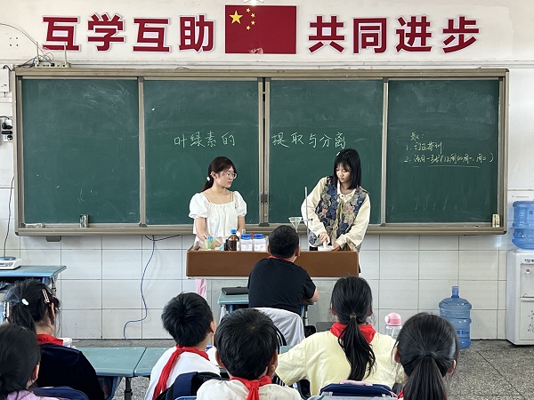 在此次实践活动中志愿者们带领学生们开展了一场生动有趣的科学课程,“叶绿素的提取与分离”实验。课上,志愿者向他们解释实验的原理,介绍实验的步骤及叶绿素的组成,互动环节,学生们跃跃欲试,亲身参与其中,剪叶片、研磨叶片、制作层析条,观察现象,提出问题,共同探索。在志愿者的讲解下,他们了解了科学知识,在实践中培养了动手能力,深刻地领悟了科学的魅力。