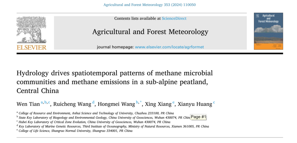 近日,我校资源与环境学院青年教师田文博士在农林科学领域的中国科学院一区Top期刊《Agricultural and Forest Meteorology》上发表了题为“Hydrology drives spatiotemporal patterns of methane microbial communities and methane emissions in a sub-alpine peatland, Central China”的文章。该研究通过长期的野外定位观测结合分子生物学手段揭示了水文驱动下亚热带地区亚高山泥炭地甲烷排放时空变化的微生物学驱动机制。