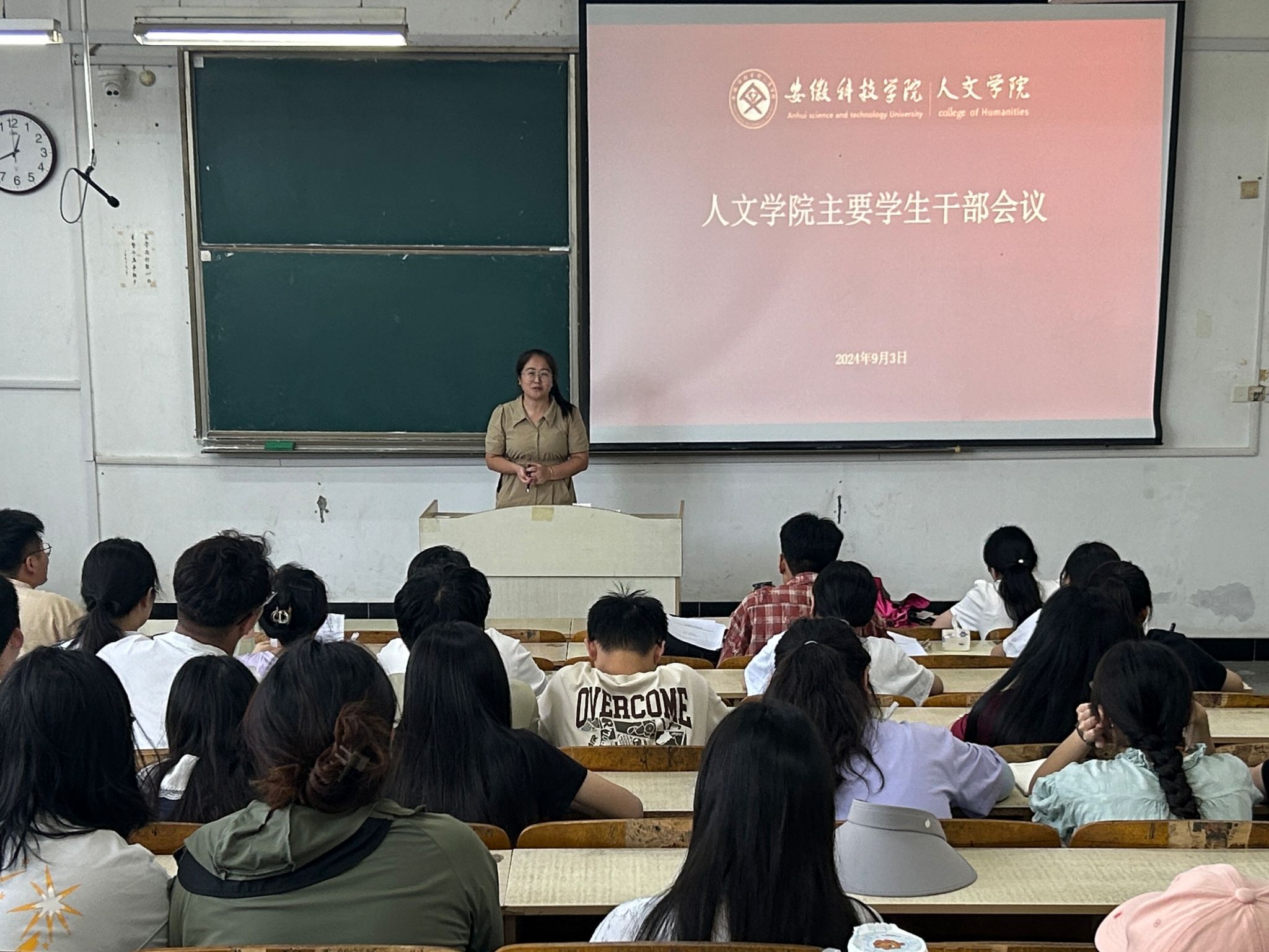 为进一步加强学生干部队伍建设,增强服务意识,提高工作能力,统筹部署新学期学院学生工作,9月3日,人文学院在求知楼A203召开2024年秋季学期主要学生干部会议。学院党委副书记李沙娜出席并讲话,各班班长、团支书、学习委员参加。会议由分团委副书记焦雪松主持。
