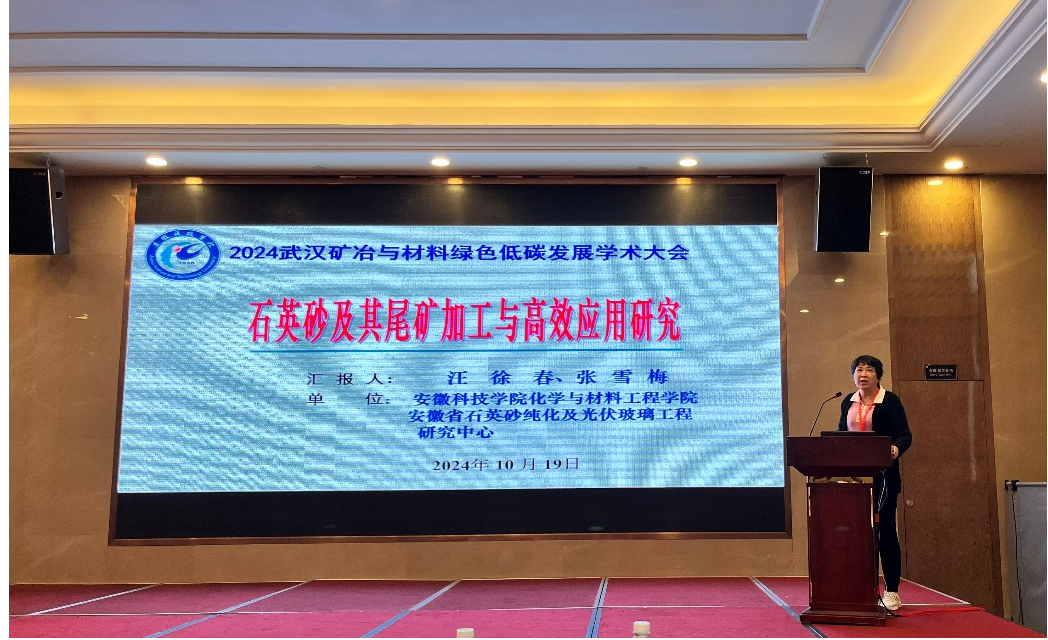 10月19日,由中国地质大学(武汉)、武汉工程大学、武汉科技大学、武汉理工大学、湖北三峡实验室联合主办的2024武汉矿冶与材料绿色低碳发展学术大会在武汉开幕。安徽省石英砂纯化和光伏玻璃工程研究中心主任汪徐春一行应邀参加。我校张雪梅教授代表安徽省石英砂纯化和光伏玻璃工程研究中心,作了题为“石英砂及其尾矿加工与高效应用研究”学术交流报告,介绍了工程中心基于凤阳硅基产业的石英砂绿色纯化技术、石英砂尾矿资源化利用等方面一系列有益的探索和成效,引起与会者热烈讨论。