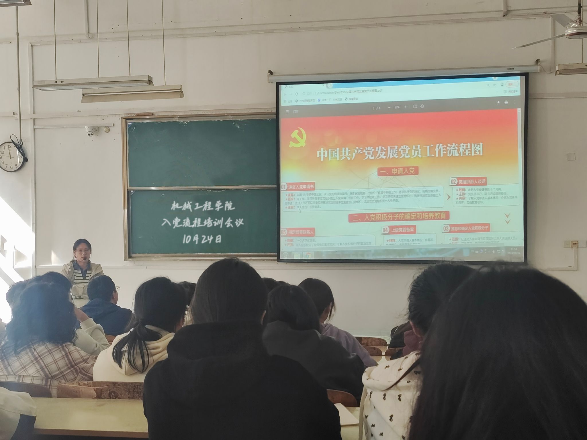 10月24日中午,机械工程学院在求知A102教室召开入党流程培训专项工作会议,全体非毕业班团支部书记参加,会议由学院党委组织员姚迪主持。