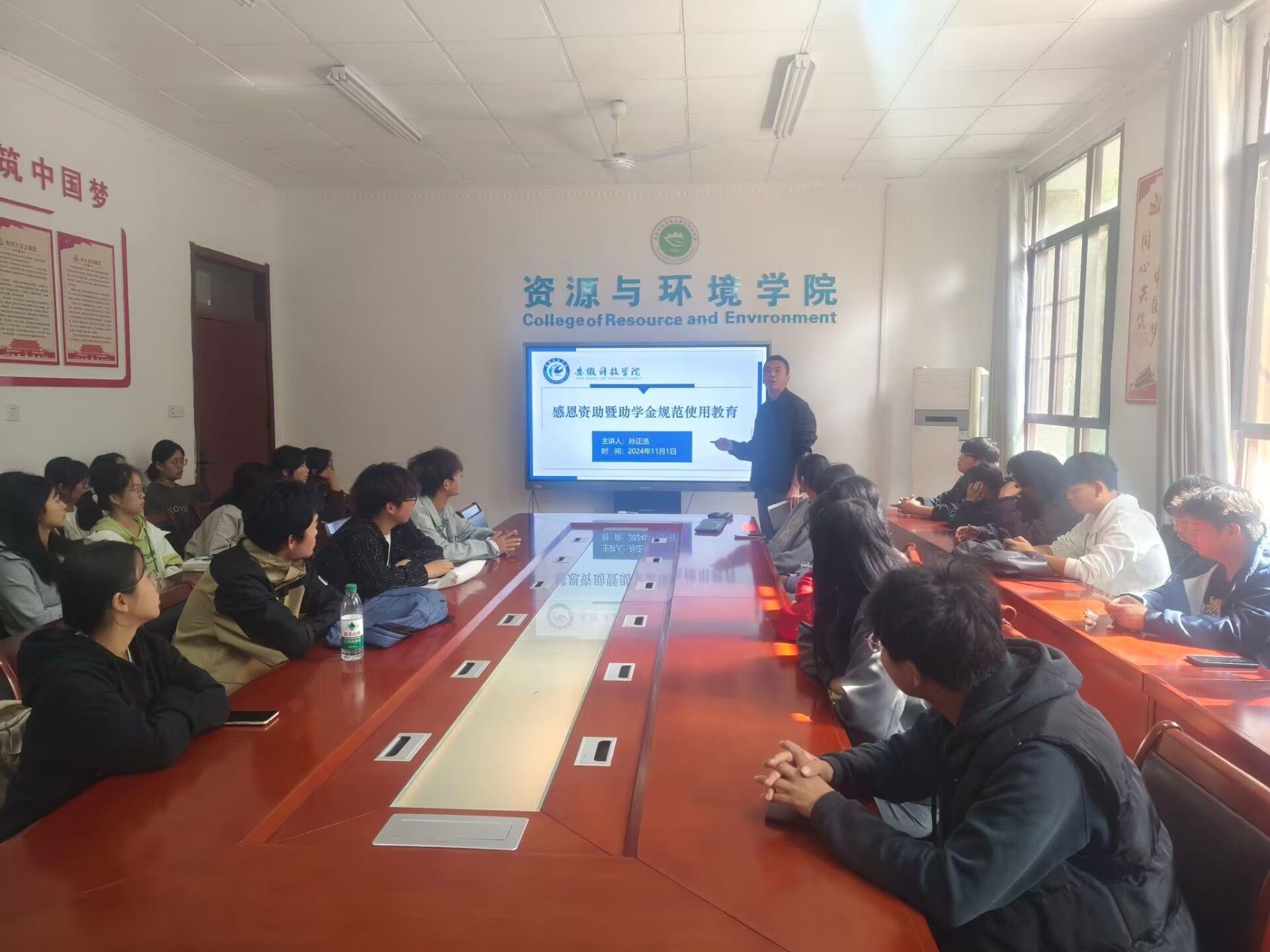 11月1日中午,资源与环境学院在学院会议室召开感恩资助暨奖助学金规范使用教育会议。专职辅导员孙正浩及24级获得国家助学金的同学参加会议。