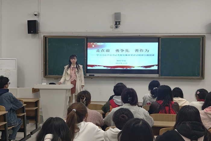 此次团课以“走在前 勇争先 善作为”为主题。薛枫带领参会人员深入学习习近平总书记考察安徽重要讲话精神,通过视频了解安徽各地在科技创新、文化传承、社会治理等方面的积极探索和实践成果,让学员们直观感受到了习近平总书记重要讲话精神在安徽大地的生动实践。她希望与会学生干部,一是要秉持报国理想,勇担责任使命,绘好“走在前”的青春底色;二要立足自身岗位,奋发进取当表率,树立“勇争先”的担当品质;三要立大志、明大德、成大才、担大任,敢想敢为善作善成,培养“善作为”的优良作风。