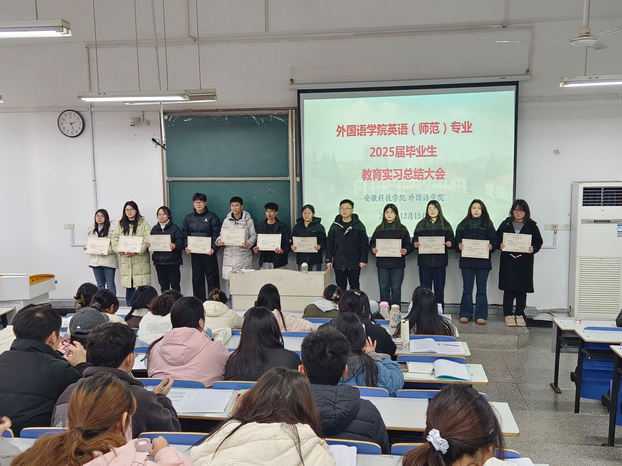 12月13日下午,外国语学院在求知楼A106教室召开2025届英语(师范)专业毕业生教育实习总结大会。学院党委副书记张海亮,副院长洪民出席并讲话,学院有关教师和2021级英语(师范)专业全体实习生参加本次会议。会议由洪民主持。