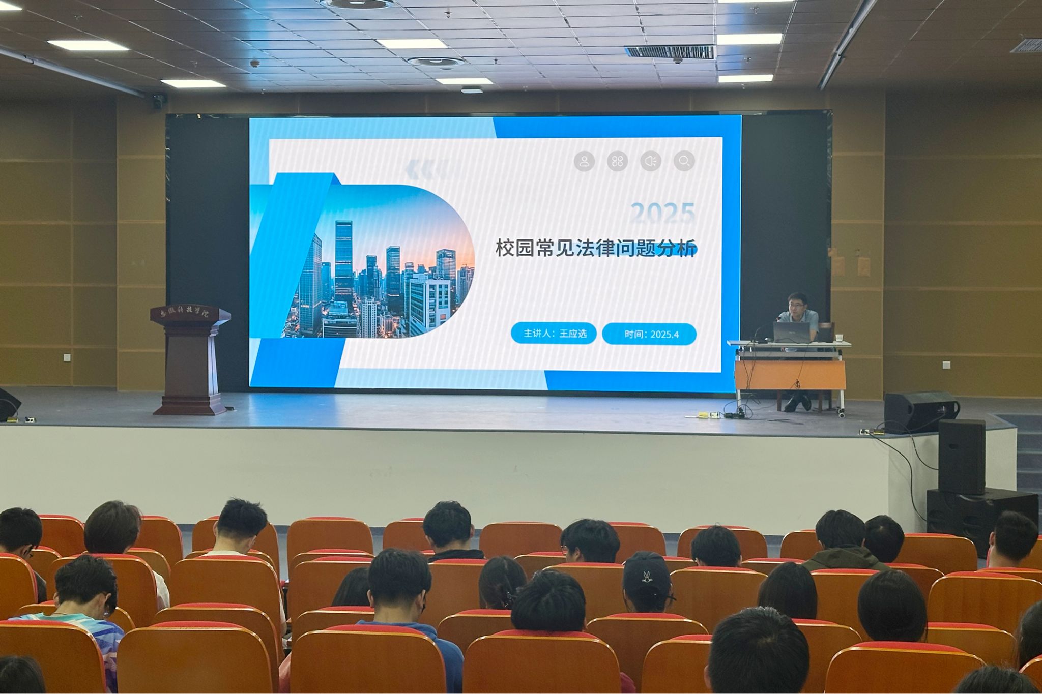 王应选以“校园常见法律问题分析”主题,通过对高空抛物的法律责任与防范、校园快递丢失的法律应对、校园贷的风险与防范、校园APP信息泄露的法律保护、校园法律意识的培养与提升等常见法律问题阐述,构建了校园法律生态的全景式图谱,强调了提高校园法律意识的重要性。