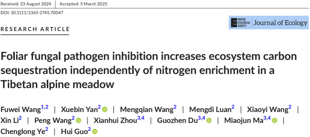 近日,我校资源与环境学院汪建飞教授团队青年教师王伏伟博士在生态学权威(中国科学院一区Top)期刊《Journal of Ecology》上发表了题为“Foliar fungal pathogen inhibition increases ecosystem carbon sequestration independently of nitrogen enrichment in a Tibetan alpine meadow”的文章。该研究通过长期野外定位试验,揭示了叶片病原真菌和氮素有效性对高寒草甸生态系统碳固定的影响机制。