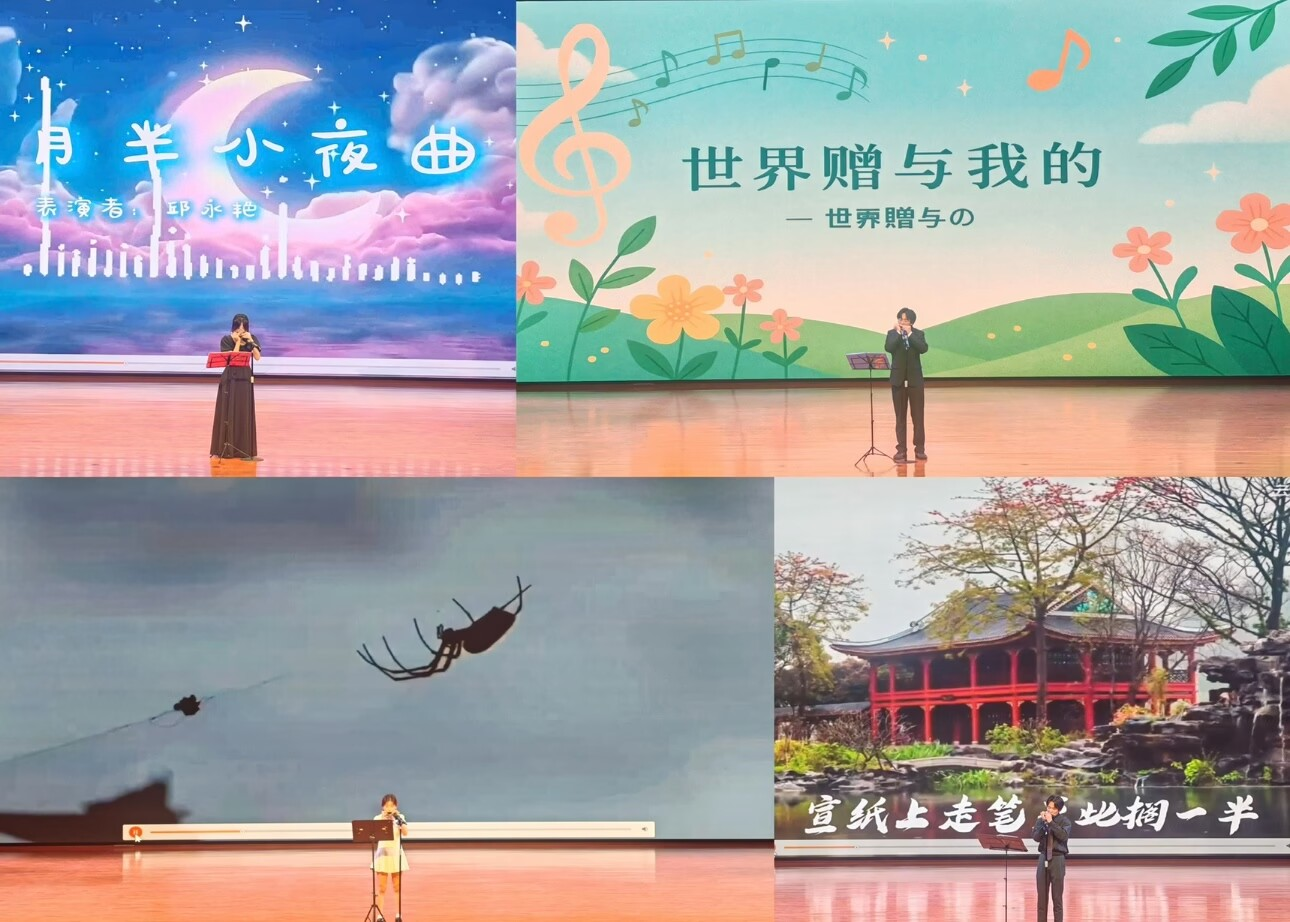 本次大赛作为我校美育选修课《乐理与视唱》课程本年度的汇报演出,来自该课程的20同学也带来了他们的独唱、合唱以及器乐节目展演,其中钢琴演绎的《土耳其进行曲》和口琴独奏的《月半小夜曲》,以其明快奔放的节奏和细腻递进式的情感表达引发全场观众的强烈共鸣,最终以精湛的演绎荣获大赛一等奖。