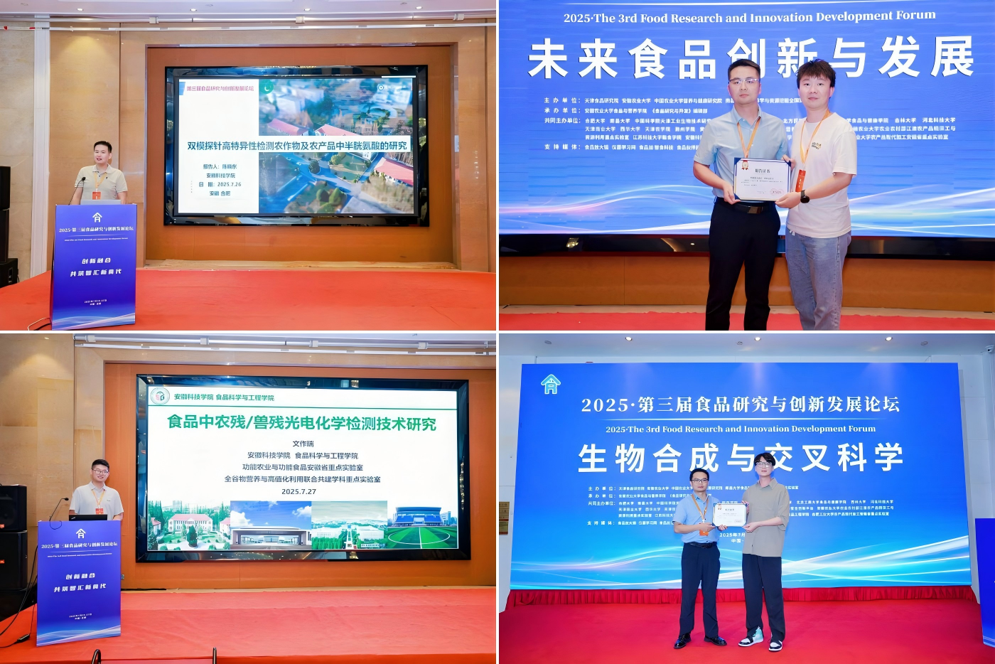 作为共同主办方,半岛app官方在线入口食品科学与工程学院深度参与本次论坛,杜传来与翟立公分别担任大会学术委员和执行委员,翟立公主持了食品微生物与肠道健康分论坛,四位青年博士分别在四个分论坛上做了学术报告。陈晓东博士以“双模探针高特异性检测农作物及农产品中半胱氨酸的研究”为题,介绍了其高特异性方法检测半胱氨酸的研究成果;黄明远博士以“表面电荷效应驱动多糖-蛋白互作改善水溶肌原纤维蛋白功能特性”为题,重点揭示了表面电荷效应驱动多糖与蛋白互作机制;文作瑞博士围绕“食品中农残/兽残光电化学检测技术研究”,重点阐述了其通过电化学技术检测农残兽残的关键突破;曾剑华博士以“牛乳αs1酪蛋白构象抗原表位定位及其高效靶向破坏研究”为题,重点介绍了牛乳αs1酪蛋白抗原靶向消减的技术突破及相关研究成果。