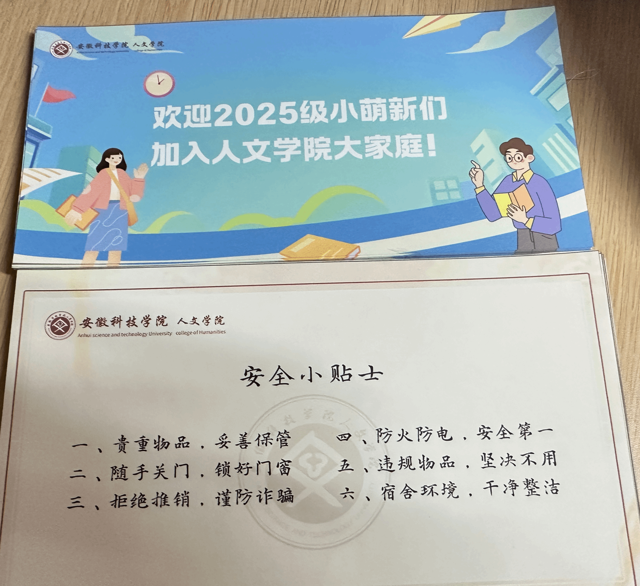 一方门扉,一方天地;一句叮嘱,一份守护。学院为2025级新同学定制的迎新宿舍小贴士,印有“随手关门、谨防诈骗、防火防电”等暖心提示,是送给萌新们的“安全守护礼”。迎新工作人员将这张小贴士仔细地贴在每间新生宿舍的门扉上,把“润物细无声”的安全叮嘱与人文温度,送进每位新生的“大学小家”。——愿这张小小贴士,能守护新同学在安全、温暖的环境中,开启属于自己的人文成长故事。