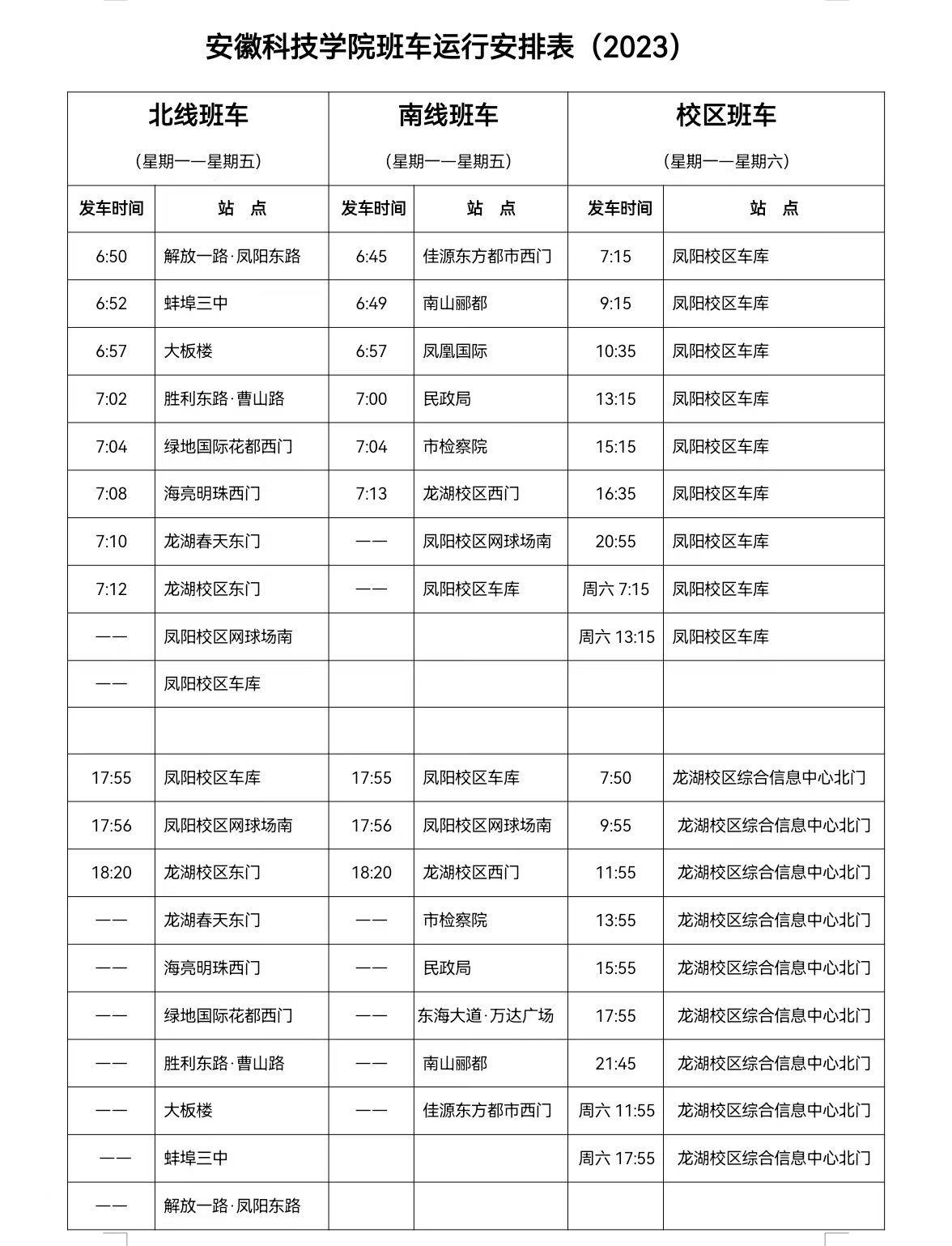 2.校区班车运行时间为:凤阳校区车库7:30、13:30;龙湖校区综合信息中心北门12:10、17:40。