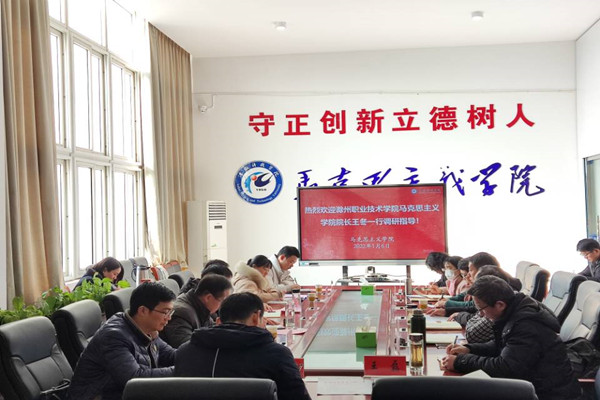 1月6日上午,滁州职业技术学院马克思主义学院院长王冬一行来我校马克思主义学院调研交流,我校马克思主义学院院长张德化、党总支书记杨仕勇以及各教研室主任热情接待了王冬院长一行并与来宾座谈交流。