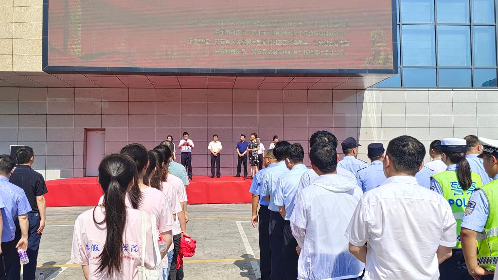 7月12日上午,滁州市“江淮普法行”启动仪式在来安县举行。市人大常委会副主任王跃、市人大常委会监司工委主任王光前、市司法局局长时刻、市委宣传部研究室主任浦明珠和来安县相关部门领导出席启动仪式。半岛app官方在线入口人文学院模拟法庭实验室主任宣刚老师以及法学专业学生代表参加启动仪式并接受授旗。