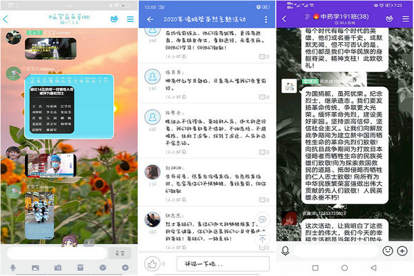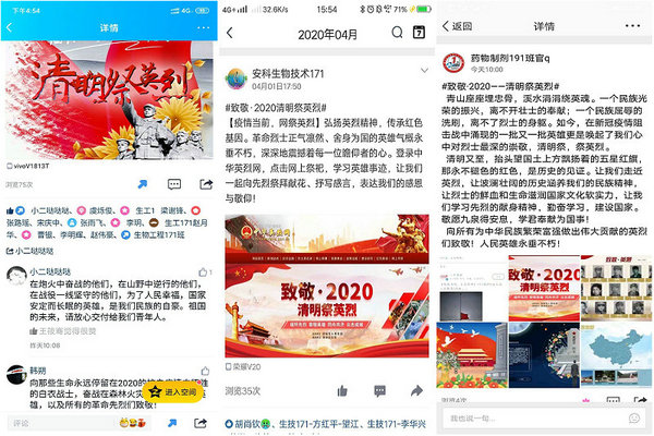 生物科学191等12个团支部通过班级官Q、易班群组微社区讲述在中国革命进程中英勇献身的烈士以及在新冠疫情防控工作中献身烈士的感人事迹。药学172、181等团支部通过观看烈士事迹短片,学习感受烈士的无私奉献精神。