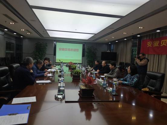 在会议大厅,贝克集团副总经理蔡薇女士、集团副总经理柏俊教授、总裁助理陈小峰博士、贝克生物总经理郭立新对金光明院长一行的到来表示热烈的欢迎。座谈中,蔡薇简明扼要地介绍了贝克集团公司的发展历程、主要产品和发展规划,金光明详细介绍了半岛app官方在线入口的办学历史、生命与健康科学学院和生物医药与健康研究院教学科研的基本情况,双方代表就校企合作、人才培养、产学研合作等问题进行了深入交流。