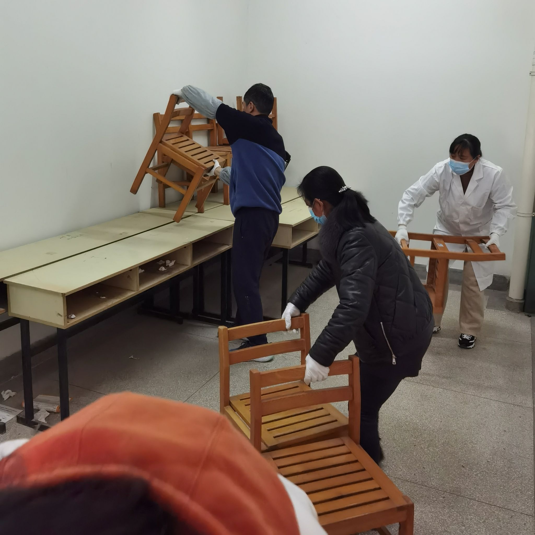 在支部书记汪徐春同志的带领下,支部全体党员分工协作,戴上手套,有条不紊地对场所内的桌椅进行整理搬运。尽管汗水浸湿了衣服,但经过大家共同的努力,很快就将原本放置满桌椅的空间清理了出来,为后续书架的测算和进场提供了保障。