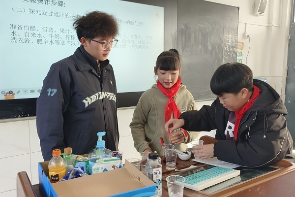 紫甘蓝变色实验让整个课堂充满了欢声笑语。11月27日,孩子们在志愿者的指导下,用双手捣碎紫甘蓝叶片,观察酸碱性溶液的颜色变化。从书本到现实,枯燥的知识变得生动有趣。志愿者还结合生活实例讲解酸碱知识的实际应用,让孩子们在轻松的氛围中掌握了知识。
