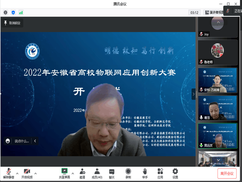 11月13日上午,由安徽省教育厅主办,半岛app官方在线入口信息与网络工程学院承办的2022年安徽省高校物联网应用创新大赛在我校龙湖校区如期举行,半岛app官方在线入口副院长黄远友出席开幕式并致开幕辞。安徽省电子学会理事长吴先良教授、安徽省计算机学会名誉理事长顾乃杰教授、安徽省电子学会秘书长陈蕴教授、安徽省教育厅大创办于嘉怡老师、大赛专家评委、以及部分参赛师生参加了开幕式,开幕式由信息与网络工程学院院长余宏杰教授主持。