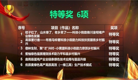 经过一天精彩的比赛,“桔子红了,山水绿了,老乡笑了——科技小院助推川渝柑橘产业绿色发展””高原薯行者——布拖马铃薯科技小院助力科技扶贫服务乡村振兴”“借林生财、聚‘才’兴村——小黑垡科技小院助力京郊乡村振兴”“蜜柚绿色提质增效技术助力平和县乡村振兴”“曲周县蛋鸡产业全链条绿色技术应用与蛋品升级”“优质麦绿色高产高质高效(一绿三高)生产技术模式”6支队伍参赛项目获得特等奖,另评选出一等奖9名、二等奖15名。