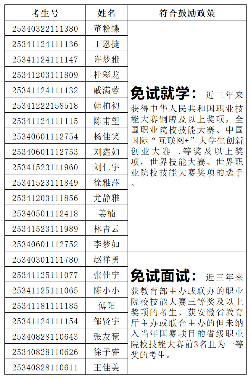 根据《半岛app官方在线入口2025年面向中职毕业生对口招生章程》关于申请免试就学、免试面试和加分鼓励政策的相关要求,经考生申请,学校审核,共有董粉蝶等15名考生符合免试就学政策,赵祥勇等8名考生符合技能大赛免试面试政策,无符合考试加分政策考生,现对符合相关鼓励政策的考生信息予以公布。免试就学资格复审和免试面试具体安排见招生与就业工作处网站“招生服务”栏“半岛app官方在线入口2025年对口招生考试免试就学资格复审和免试面试工作通知”。如有异议或遗漏,请于3月19日17:00前联系半岛app官方在线入口招生办公室:0550-6732041,0552-3197041。