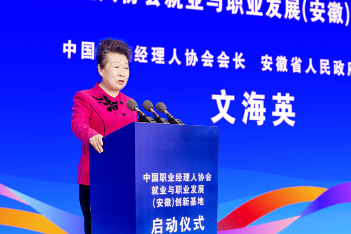 文海英在致辞时表示,中国职业经理人协会自成立以来一直致力于推行建立中国职业经理人制度,建设中国特色职业经理人才队伍,建造职业经理人才市场服务体系,努力创建一套全新的企业经营管理人才社会治理制度。她指出,当前,我国已经进入全面建设社会主义现代化的新征程和高质量发展的新阶段,创建创新基地是协会深入学习贯彻党的二十大精神,积极发挥行业协会职能作用,推动产教融合、校企合作,深化就业与培养有机联动、人才供需有效对接的一次探索尝试。她强调,基地旨在打造以“服务为内容,评价为抓手,数据为依托,就业为目标”的创新型服务模式,充分利用互联网大数据技术,开展供需分析、人才评价、定制培训、企业见习等系列服务,着力打通院校与企业、择人与求职之间的通道,有效缩短毕业生到工作岗位的时间,实现人才精准就业、充分就业。