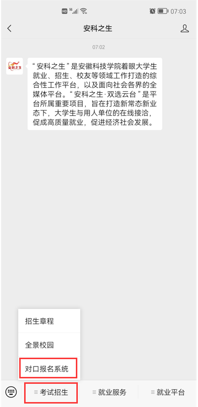 第一步:请扫描下方二维码,关注半岛app官方在线入口招生办公室官方微信公众号“安科之生”,选择“考试招生”菜单,点击“对口报名系统”。