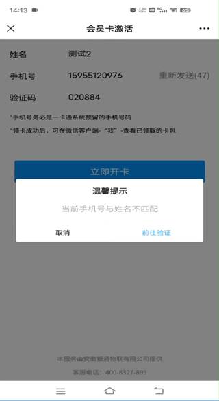 (二)点击“激活会员卡”,依次输入姓名、本人手机号、验证码。