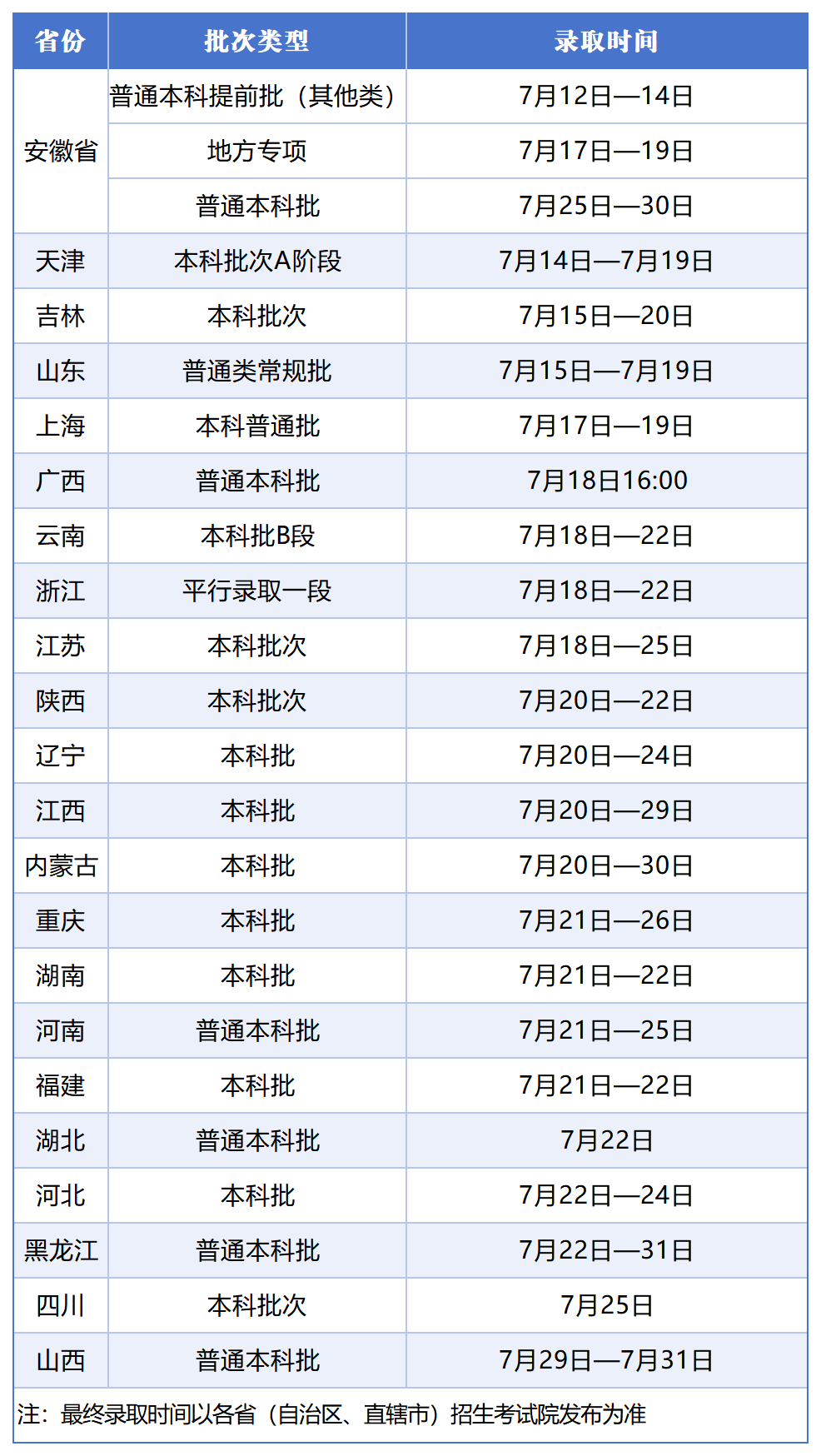 2025年各省(自治区、直辖市)高考录取日程及录取结果查询: